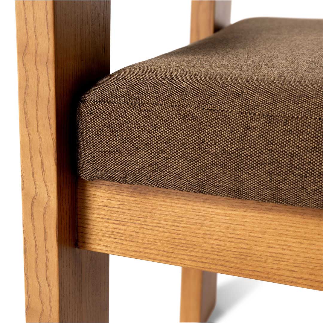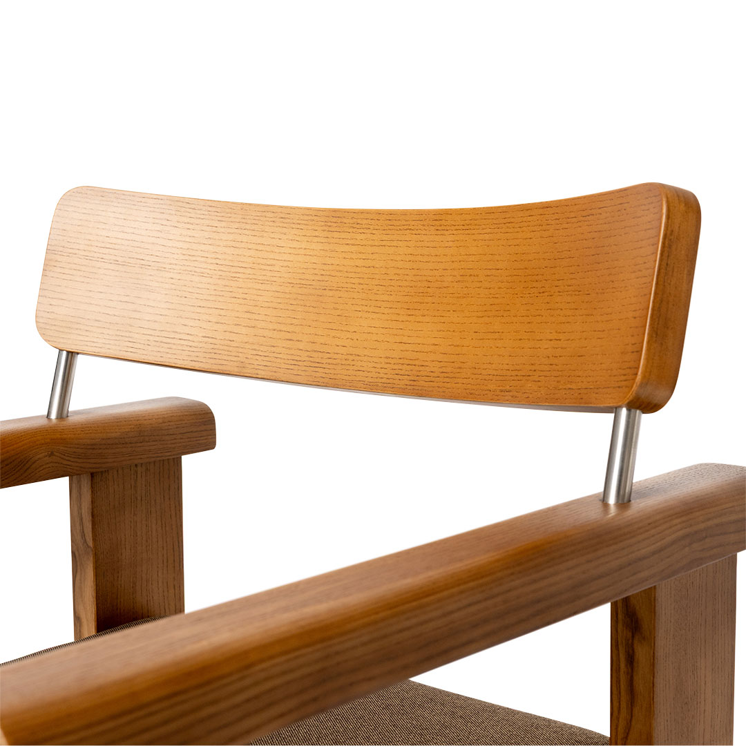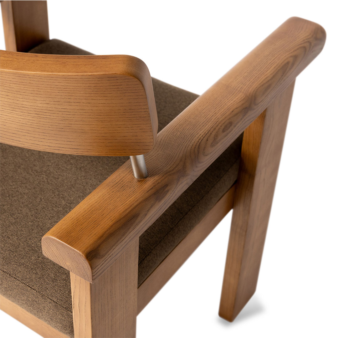 幅広の脚、Rの効いたアームレスト、バックレストを支えるガルバナイズドの支柱など、こだわりのディテールを詰め込まれた、静かな存在感を放つダイニングチェア。 フレームには無垢のアッシュウッドを使用。堅く耐久性があり、木目の豊かな表情を楽しめます。 広めの座面と木の感触が心地よく、どっしりとした佇まいに安心感すら覚えます。 同シリーズのテーブルと合わせれば、互いに造形を引き立て合い、空間に統一感と奥行きを演出。 ダイニングにはもちろん、部屋の一角に置いても画になります。